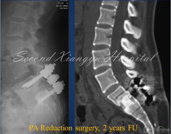 ① 对于失平衡不重者,可以采取一期后路部分复位和经骶骨轴向融合方式[4]。