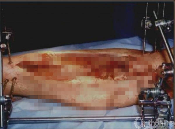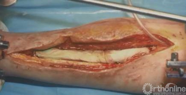 开放骨折,大段骨缺损。