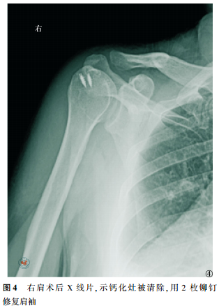 所有病例术后疼痛即刻消失,当晚夜眠良好。经过3~12个月的随访,UCLA评分由术前的(12.5±2.5)分提高至末次随访的(35.2±4.0)分,术前与末次随访比较,差异有统计学意义(t=5.317,P<0.05)。X线检查显示未见模糊的沉积病灶恢复清楚的边缘(图4);无1例发生肩关节僵硬、肩袖撕裂或新的钙化灶。