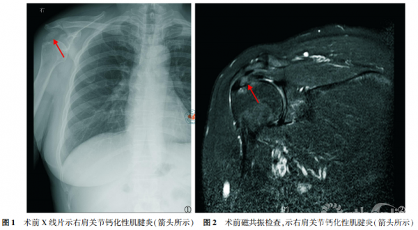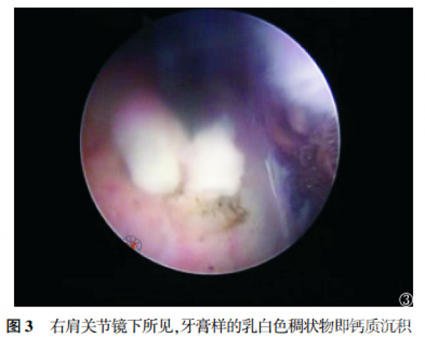典型病例 女性患者,49岁,因“右肩关节疼痛、活动受限5d”入院,查体见右肩关节局部压痛,以冈上肌处明显,右肩关节主动活动范围受限,被动活动范围基本正常,Neer撞击征(+),术前X线片示右肩峰下一巨大密度增高团块(图1),磁共振示右冈上肌腱内一信号增高团块(图2),诊断考虑“右肩关节钙化性肌腱炎”,行“右肩关节关节镜探查清理+冈上肌腱钙化灶清理+肩袖修补术”,术中清理右肩冈上肌腱内牙膏样的乳白色稠状物,即钙质沉积(图3),见肌腱裂口超过肩袖厚度的1/2,予2枚铆钉修补肩袖,术后复查右肩关节X片(图4)。术后患者疼痛程度明显减轻,随访9个月,UCLA评分由术前的11畅5分提高至33畅5分,且无出现术后并发症。