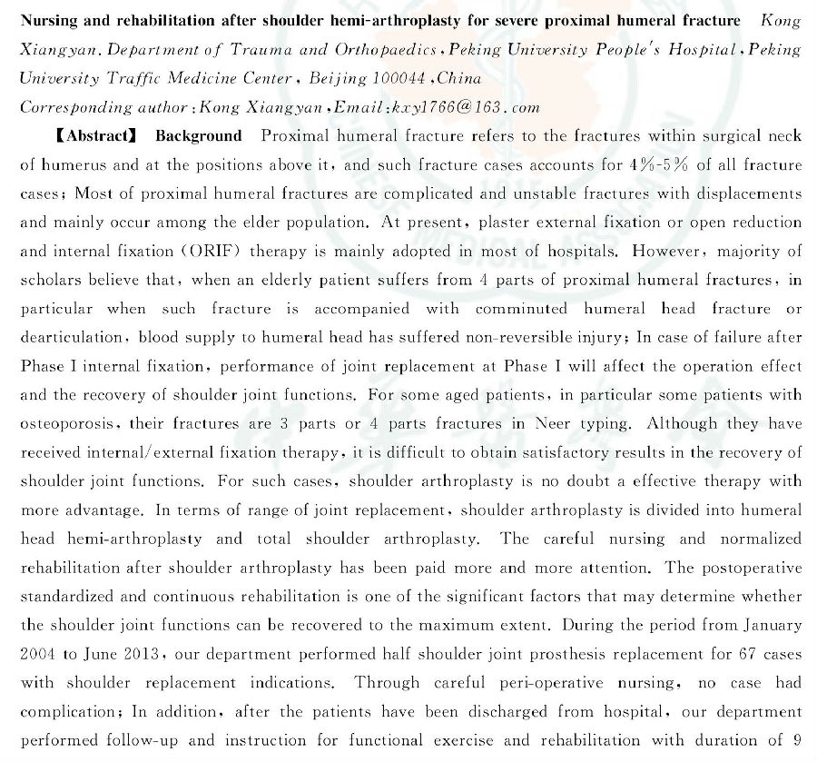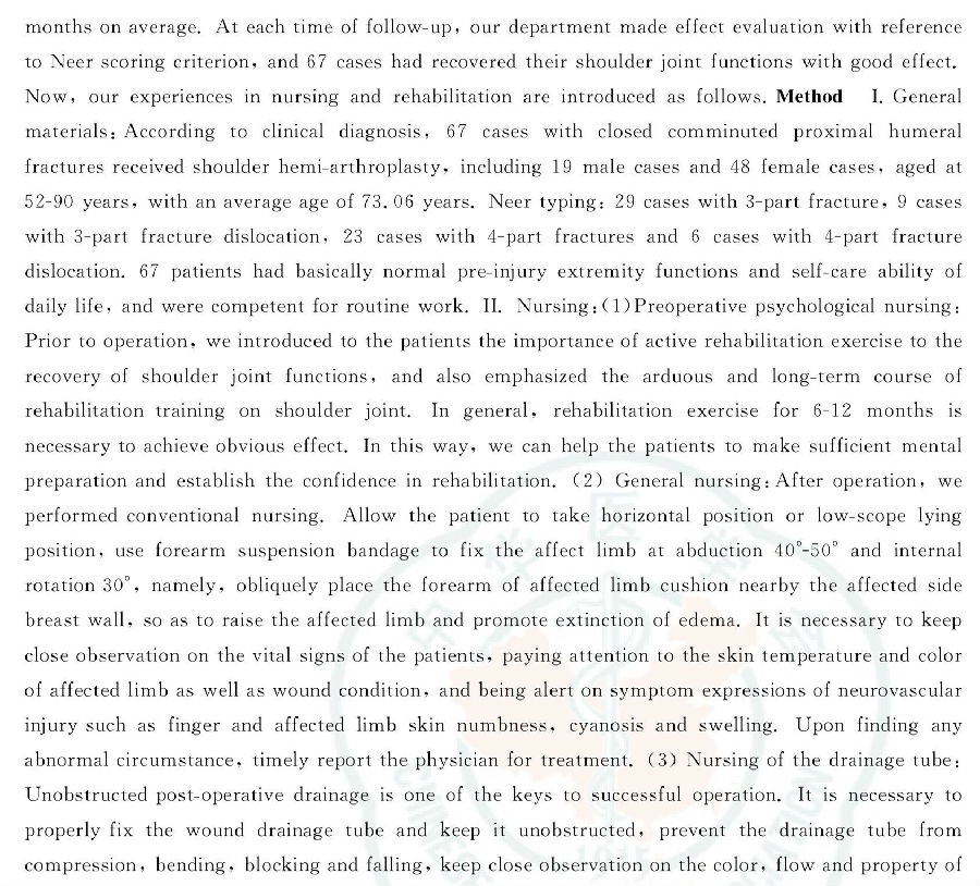 对肱骨近端粉碎骨折肩关节置换术患者,进行精心的护理和规范化的康复指导,是取得患者肩关节良好功能恢复的重要因素之一。