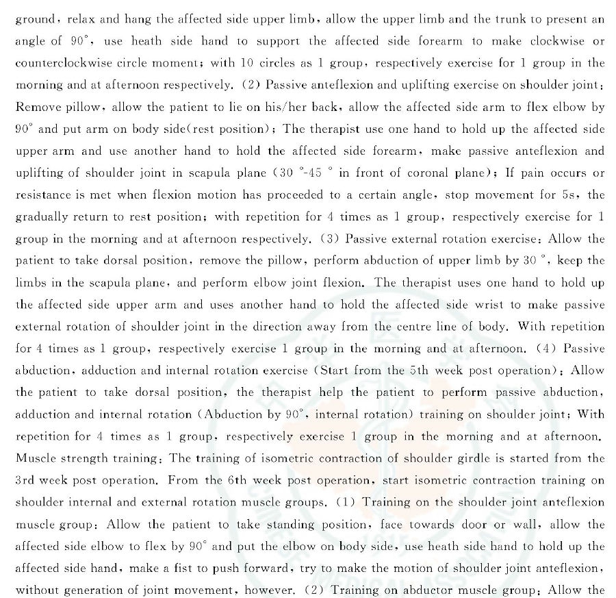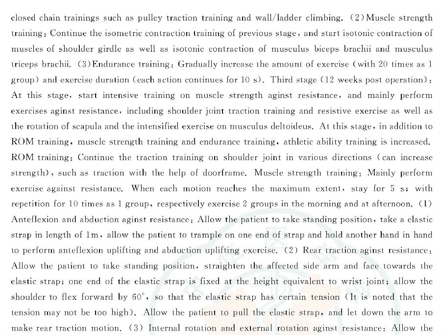2.肌力训练:肩带肌等长收缩训练从术后第3周开始,术后第6周开始行内、外旋肌群等长收缩训练。