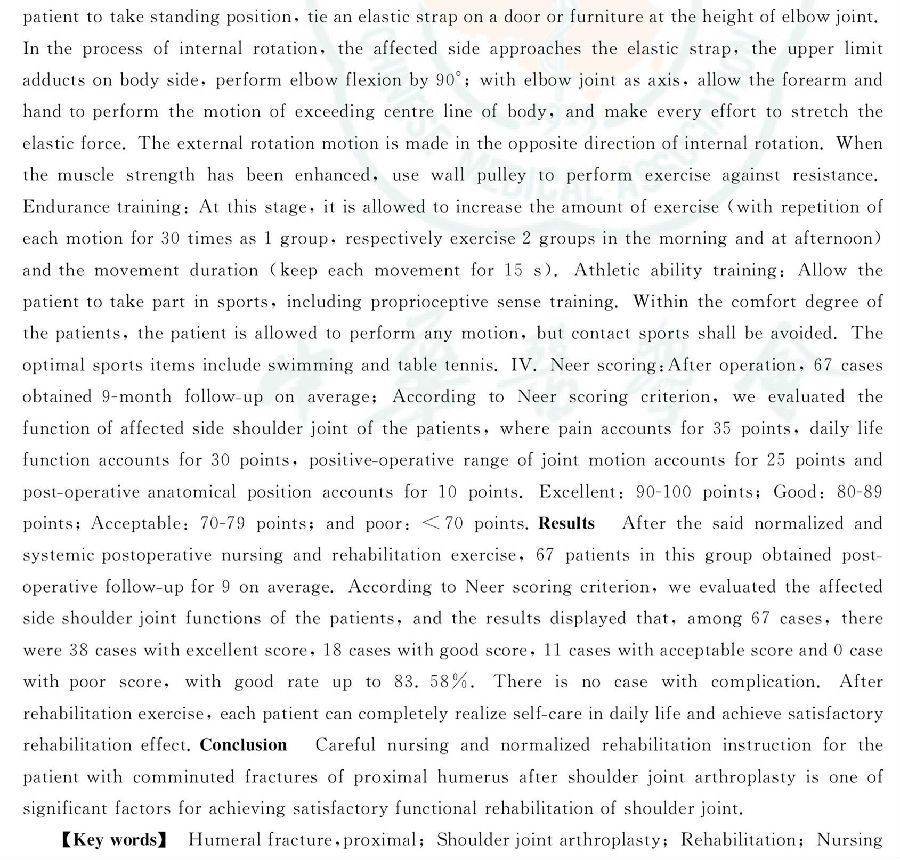 对肱骨近端粉碎性骨折肩关节置换术患者进行精心的护理和规范化的康复指导治疗,是取得患者肩关节良好功能恢复的重要因素之一。
