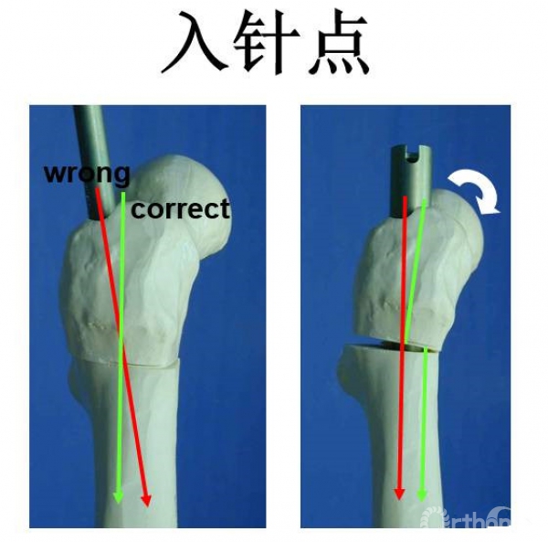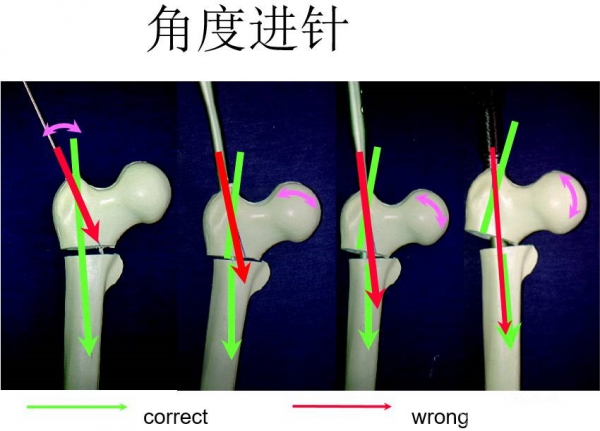 进针点选取的时候,一定注意腿的旋转。以小粗隆为参考,小粗隆稍微重叠1/3时一般为正位。