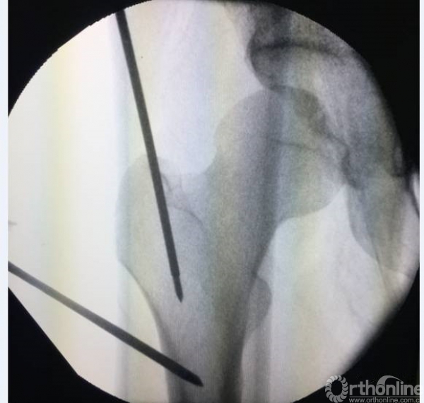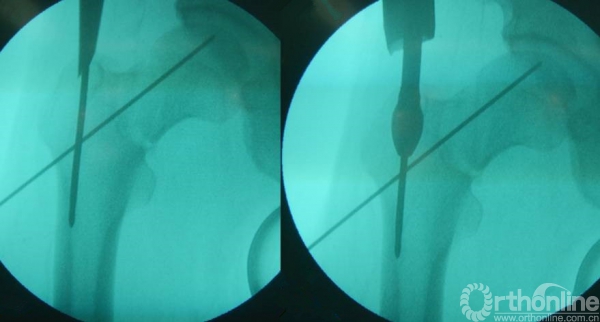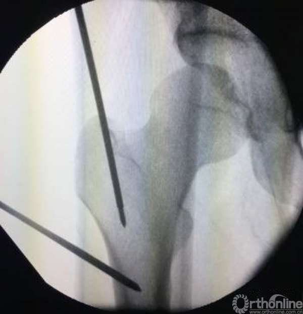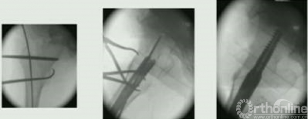 当骨折线经进钉点时,可先行头颈克氏针固定。