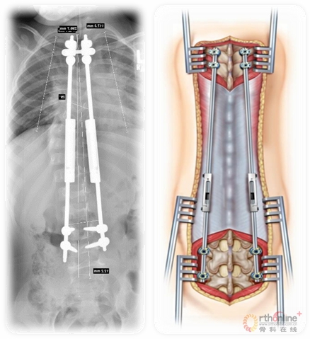■ 各种个体化的手术是为了遵循上述EOS治疗原则,使脊柱和胸部得到生长的同时控制脊柱和胸部的畸形。当支具或石膏固定控制侧凸进展失败或侧凸类型并不适合支具或石膏固定时,一般建议手术治疗。