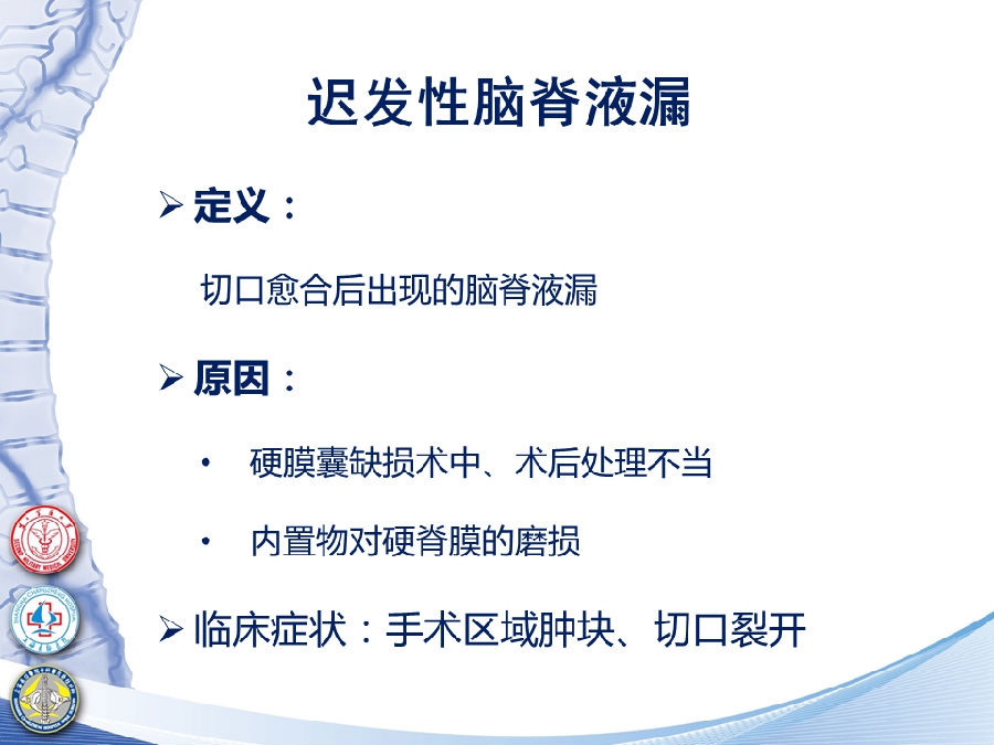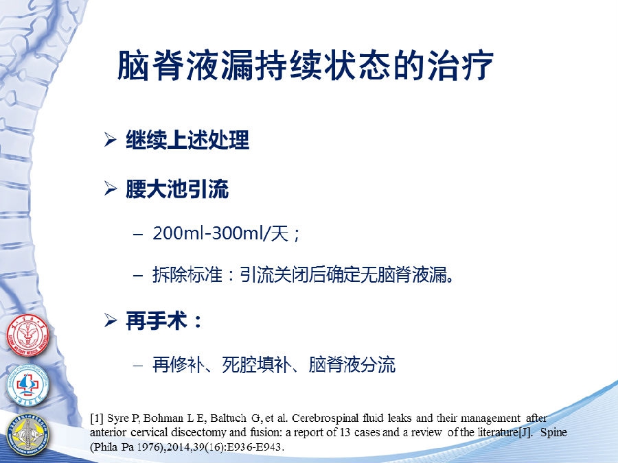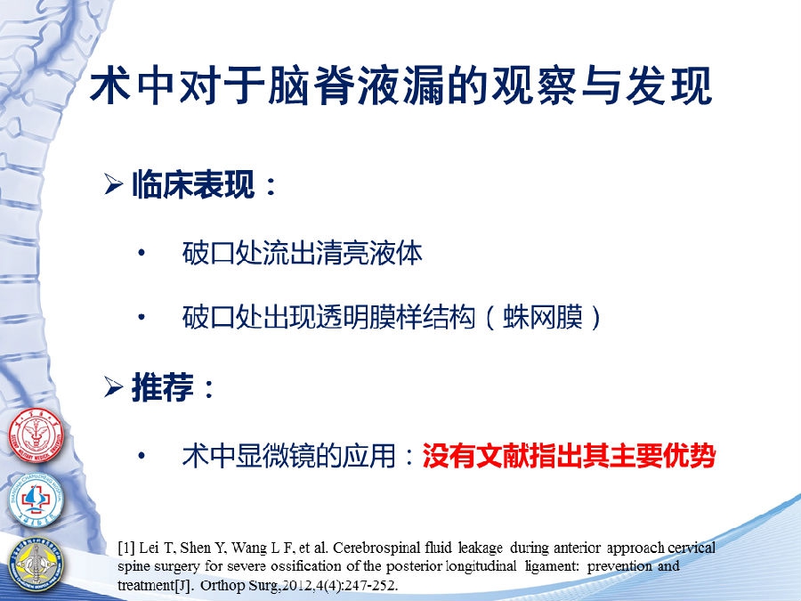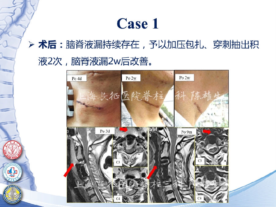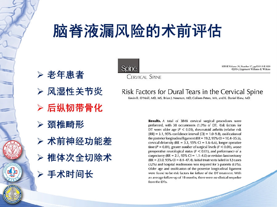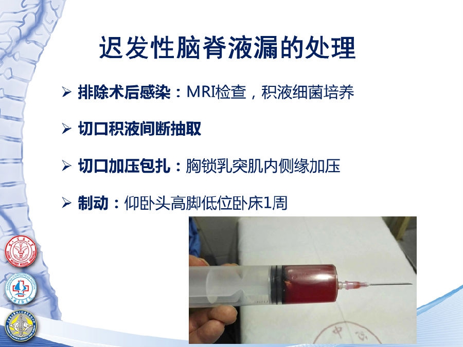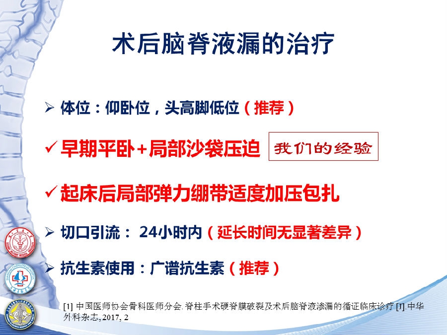 术后脑脊液漏是脊柱外科手术常见并发症,在颈椎、胸椎、腰椎后路手术中继发脑脊液漏的防治技术相对成熟,其近期及远期疗效都令人满意,但颈前路手术继发脑脊液的处理非常棘手,处理不当可能引起伤口愈合不良甚至中枢神经系统感染等严重后果。上海长征医院陈雄生教授对这一问题进行了系统的文献回顾并结合其大量的临床经验提出了一整套防治策略,非常值得同行借鉴。