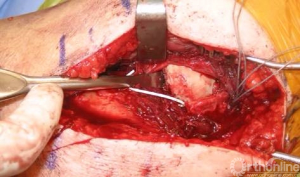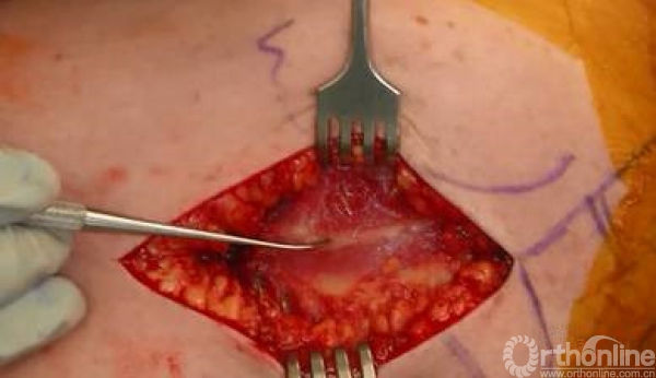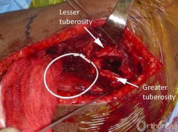 然后就可以进入肱骨近端了,整体暴露图,上方为小结节,下方为大结节。