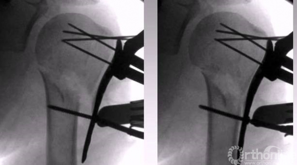 以钢板进行复位,然后用皮质骨螺钉进行提拉 完成肱骨近端解剖形态。
