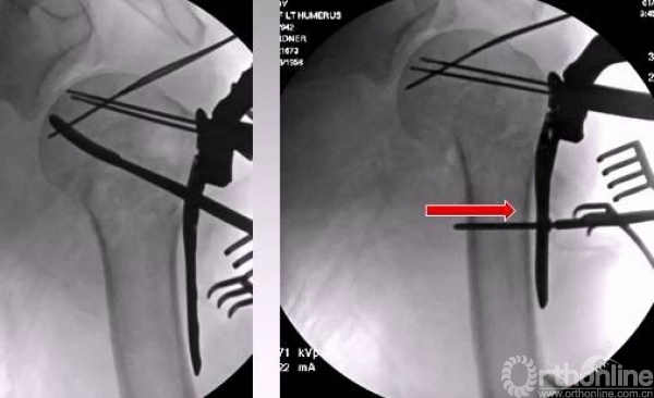 在此病例中,为了复位良好,舍弃了肱骨近端与钢板贴服。