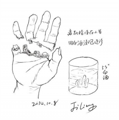 季亮举例说,“我有一个患者,四个手指都断了,居然用白酒浸泡断指送到医院,这就是典型的离断指保存不当。”而这个案例,记者也在季亮的画作中找到了原型。季亮说,离断指最简单的保存方法是用干燥的毛巾包裹送医。