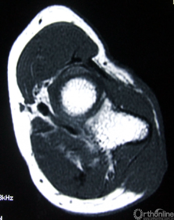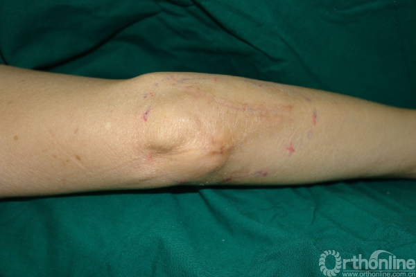 2.体格检查:右肘关节后侧可见两处手术疤痕(图1),各长约6cm、4cm,偏尺侧可触及直径约2cm肿物,质硬,边界不清,无活动度,可及压痛,局部皮肤颜色及皮肤温度未见异常,右肘关节活动无受限,右前臂及手感觉、肌力未见异常,右桡、尺动脉搏动可触及,右腋窝及肘窝淋巴结未触及肿大。