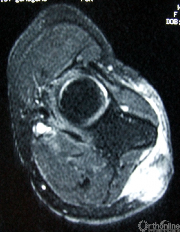 1.病史:女性,67岁,主因“发现右肘部包块24个月”收入院。患者24个月前无明显诱因出现右肘部后侧隐痛,且局部发现包块,与当地医院就诊,未明确诊断;17个月前疼痛加重,包块更加明显,于12个月前于当地医院行“肿物切除术”,术后病理示“结节性筋膜炎”;4个月前于原切口处再次出现包块,1个月前再于当地医院行“肿物切除术”,术后病理示“恶性外周神经鞘瘤”,为求进一步诊治收住入院。