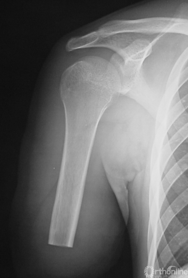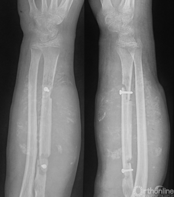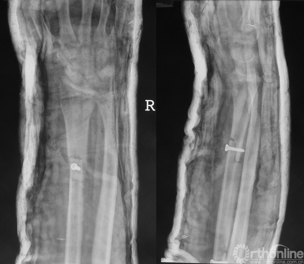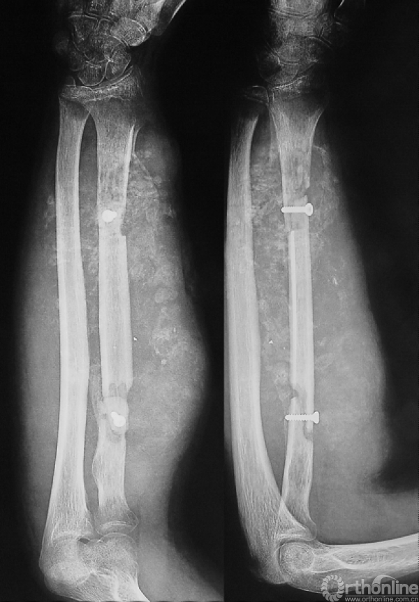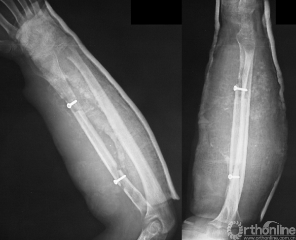 男性,16岁。患者入院3个月前摔伤右前臂,即出现疼痛、肿胀、活动受限。