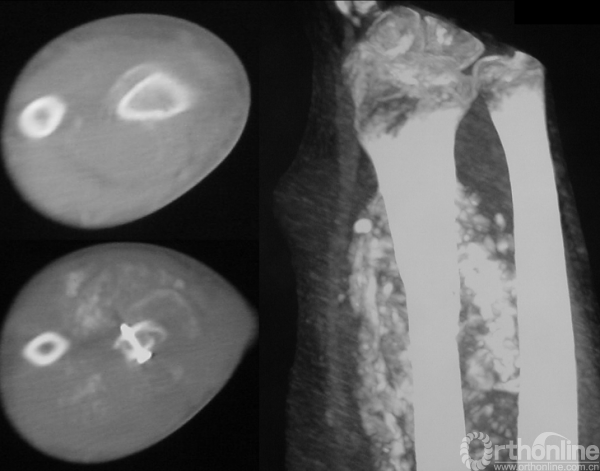 于当地医院就诊,诊断为“病理性骨折”,在未行术前活检的情况下,行“瘤段切除、腓骨移植术”。术后病理示“浸润灶和新生软骨、未见恶性肿瘤成分”。临床据此未予进一步治疗,随诊。