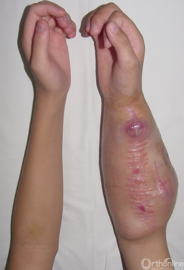 右前臂明显肿胀,可见多处手术疤痕,可触及肿物,质硬韧,边界不清,无活动度,可及压痛,局部皮色暗红,皮温稍高,未见破溃及静脉曲张。右肘关节及腕关节活动不受限。