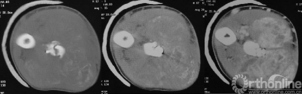 图14-8 入院时CT轴位骨窗、软组织窗、软组织增强窗(第一次术后3个月)