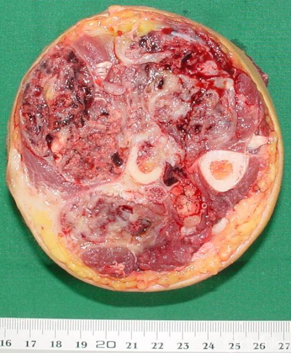 1.患肢局部皮肤条件不佳,影像学显示肿瘤巨大、与血管神经关系密切,且为术后复发,已无法评估血肿侵及范围,因此没有条件进行保肢治疗。术后的大体标本也证实了术前的判断。