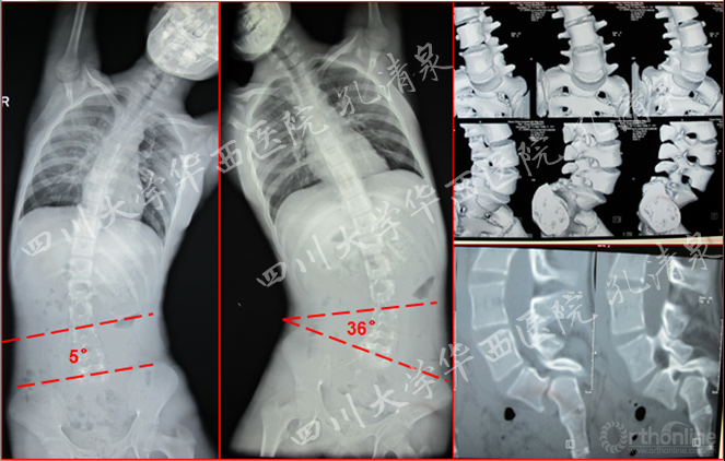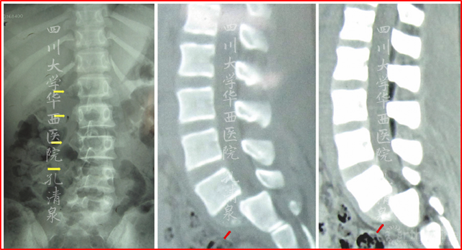治疗:经后路腰5-骶1固定、腰5滑脱、骶1骨骺复位、椎管减压、后外侧植骨融合术,术后患者双下肢麻木消失,肌力恢复正常,术后2月复查发现轻度的腰椎侧凸,术后三年复查存在27°的腰椎侧凸,取出内固定,术后六年半时CT复查示腰5和骶1高度增加2mm,残留27°的腰椎侧凸。