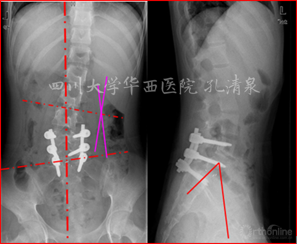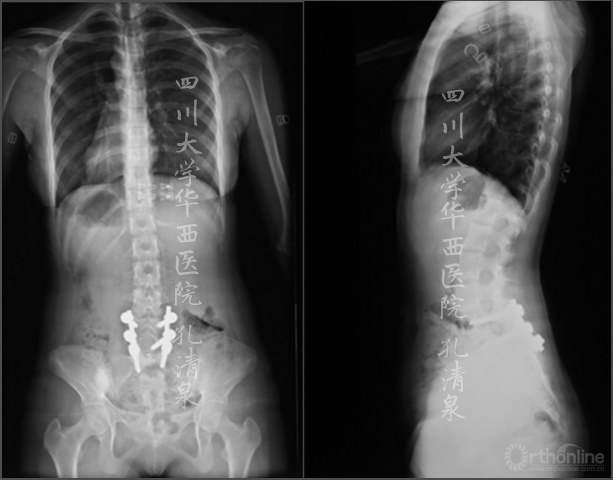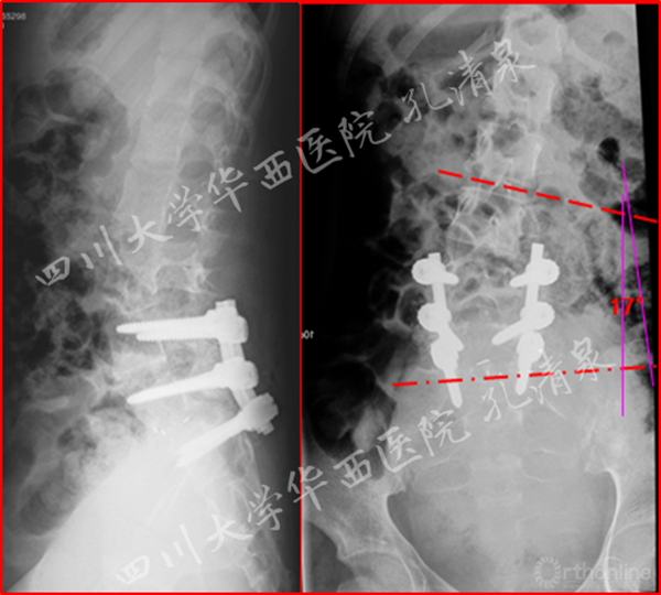 治疗:经后路腰4-骶1固定、腰5滑脱复位、椎管减压、植骨融合术,术后患者左腿疼痛消失,术后复查侧凸残留17°,术后6月复查发现侧凸自发的减轻,术后两年复查时侧凸得到完全的矫正。