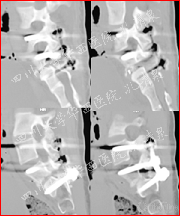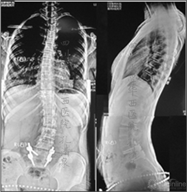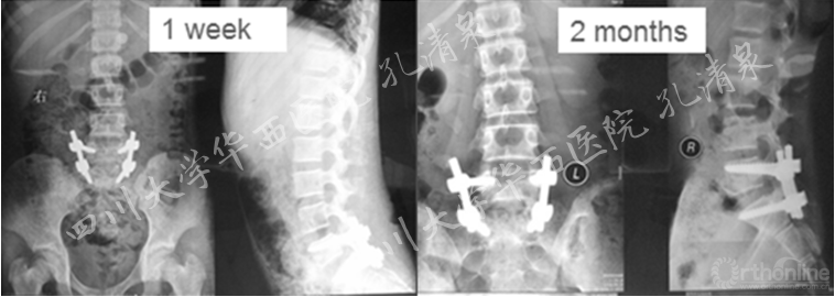 图9 术后一周复查见滑脱复位良好,无侧凸;术后两月复查,复位情况良好,可见轻微腰椎侧凸