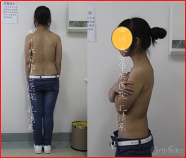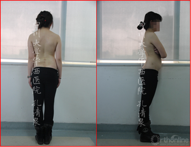 图3 患者术前的大体像提示脊柱侧凸、平背畸形、骨盆后倾