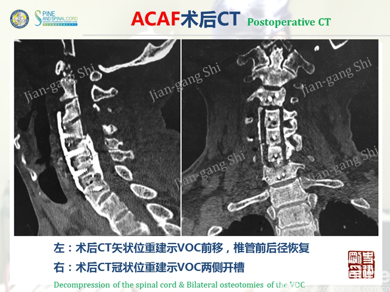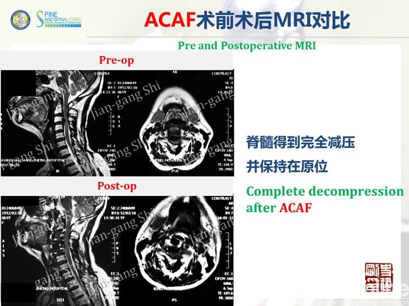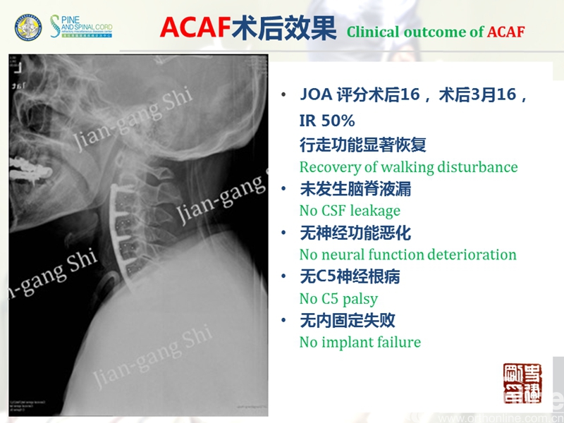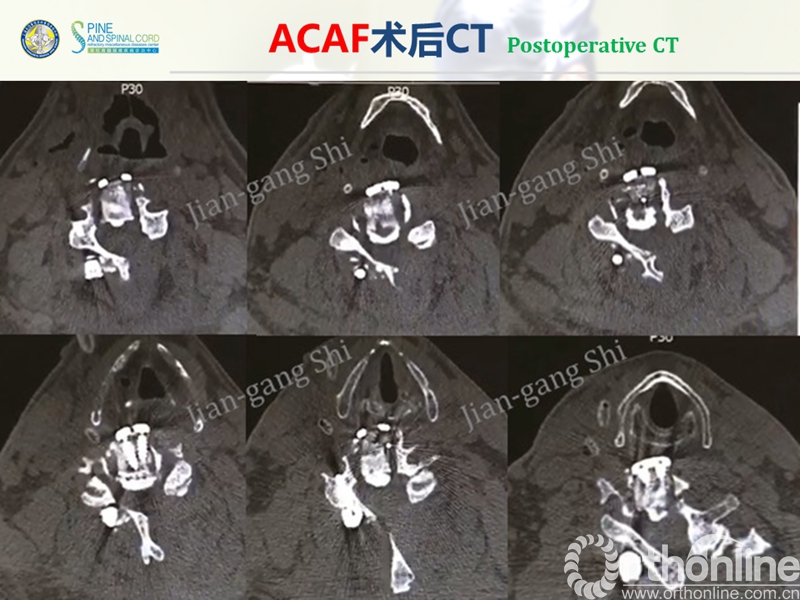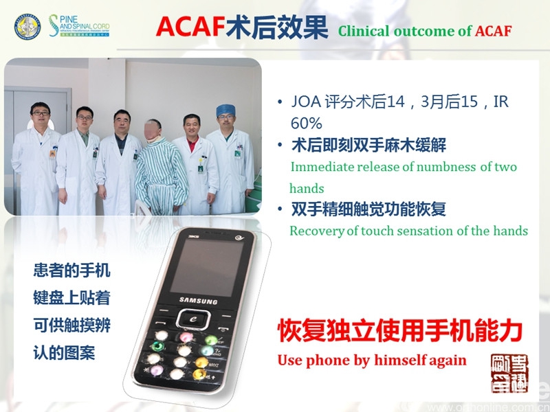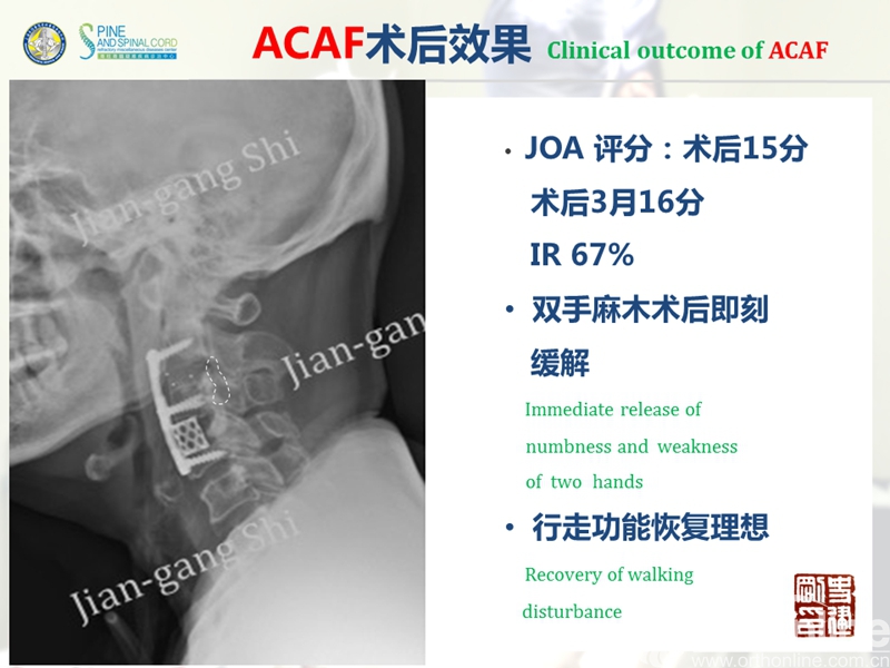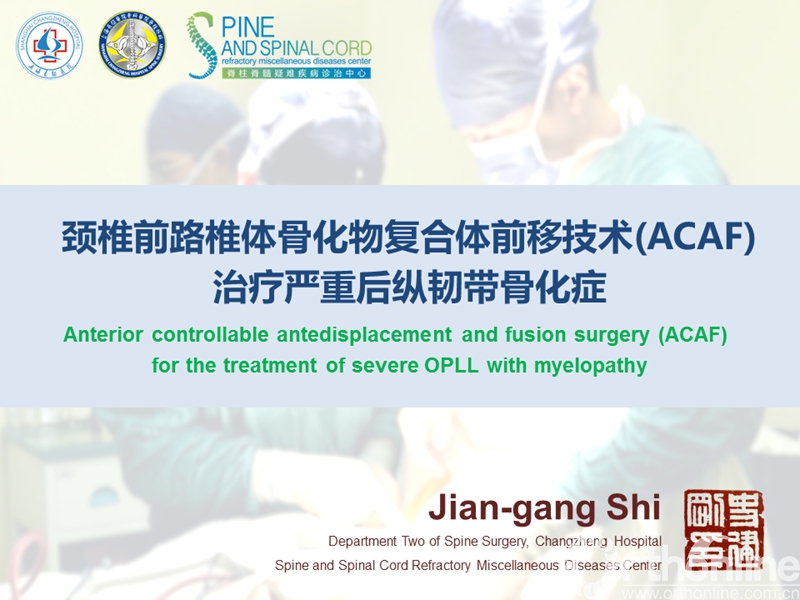 海军军医大学(原第二军医大学)附属长征医院史建刚教授团队历经多年的探索研究,在国际上首次提出颈椎前路椎体骨化物复合体前移融合术(Anterior controllable antedisplacement and fusion surgery,ACAF)治疗严重颈椎后纵韧带骨化症,该手术在不切除骨化物的情况下,从前路实现神经的直接减压,手术方法设计兼具传统后路安全性及前路手术有效性,且手术难度大大降低。至今已完成30余例手术,根据统计数据,手术并发症也明显少于传统手术技术。该技术在理念上具创新性,有望在治疗严重后纵韧带骨化症手术治疗方法中,成为一项全新有效的手术技术。