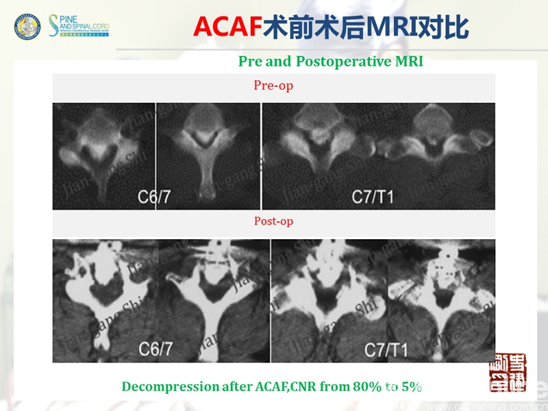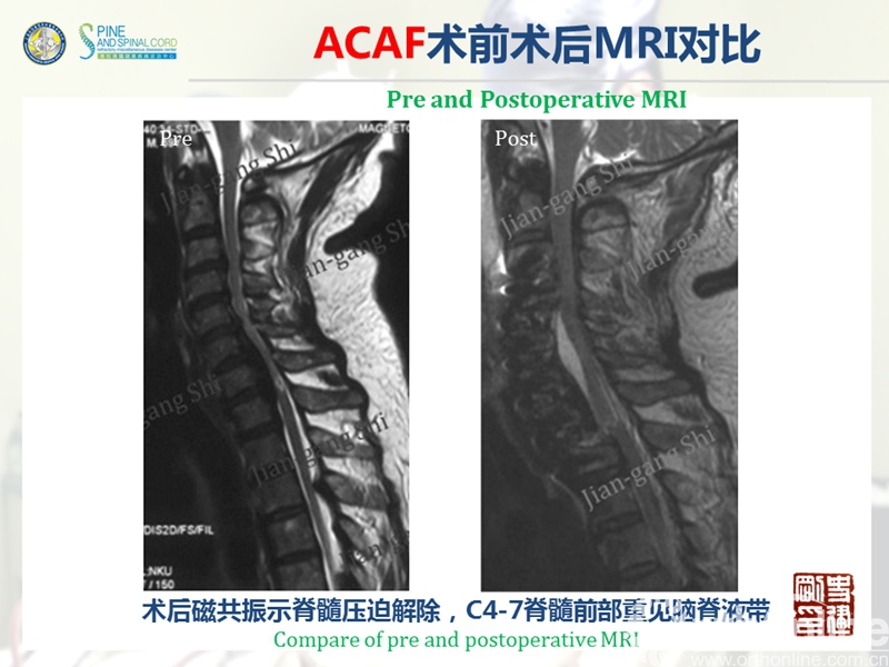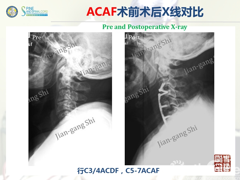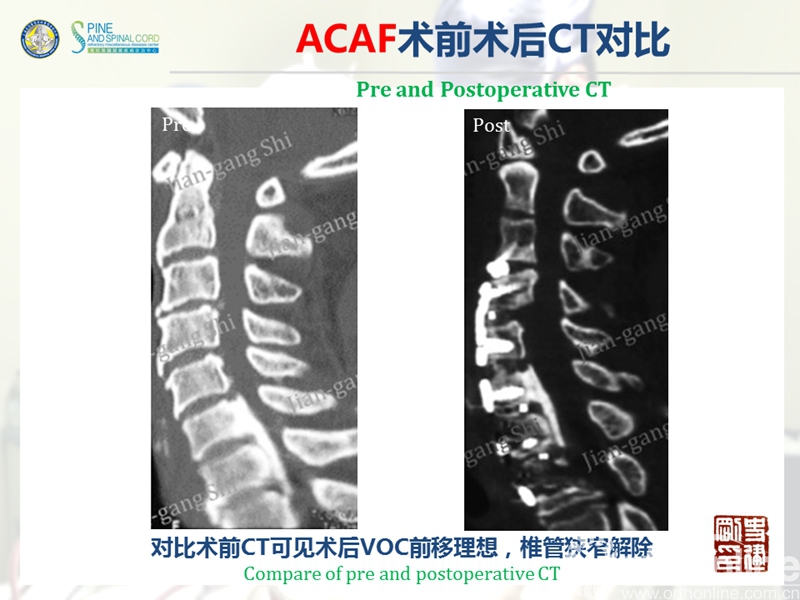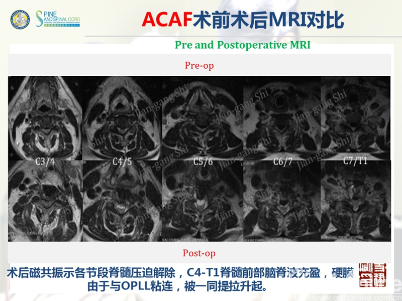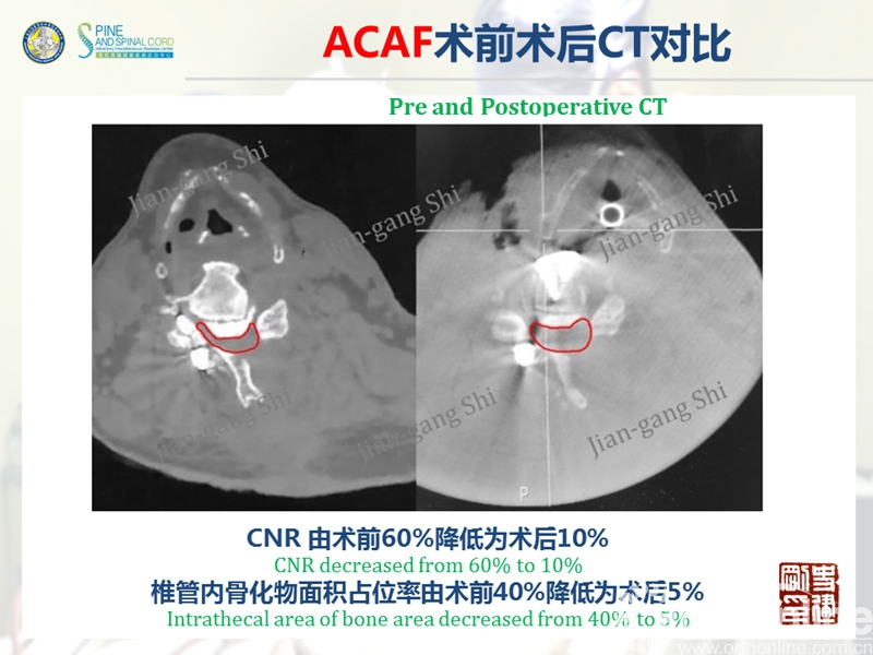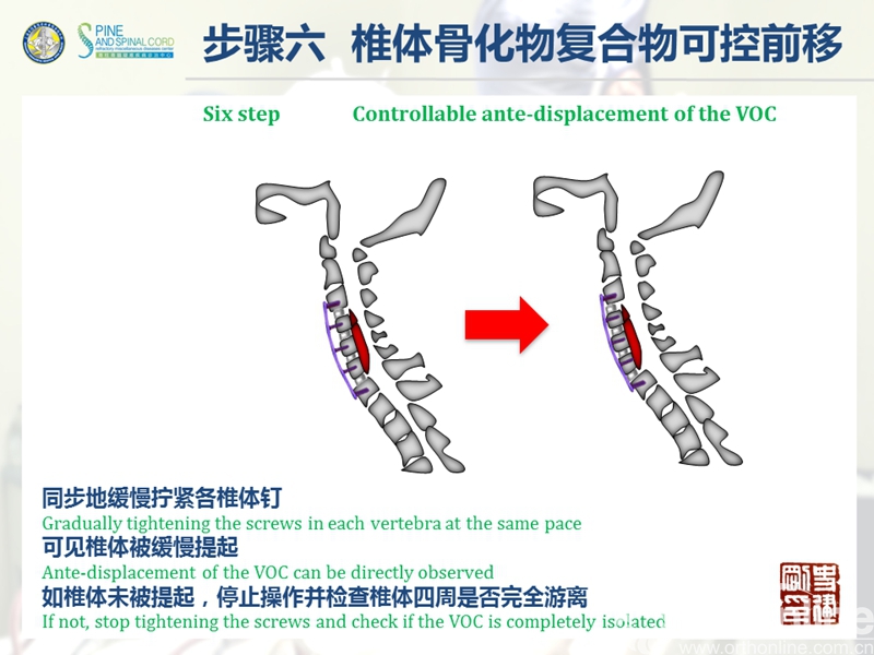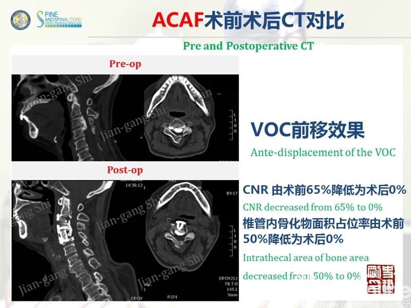 海军军医大学(原第二军医大学)附属长征医院史建刚教授团队历经多年的探索研究,在国际上首次提出颈椎前路椎体骨化物复合体前移融合术(Anterior controllable antedisplacement and fusion surgery,ACAF)治疗严重颈椎后纵韧带骨化症,该手术在不切除骨化物的情况下,从前路实现神经的直接减压,手术方法设计兼具传统后路安全性及前路手术有效性,且手术难度大大降低。至今已完成30余例手术,根据统计数据,手术并发症也明显少于传统手术技术。该技术在理念上具创新性,有望在治疗严重后纵韧带骨化症手术治疗方法中,成为一项全新有效的手术技术。