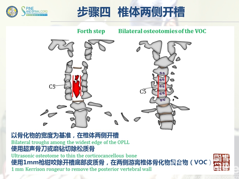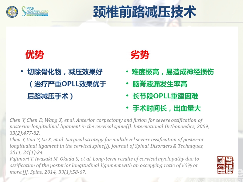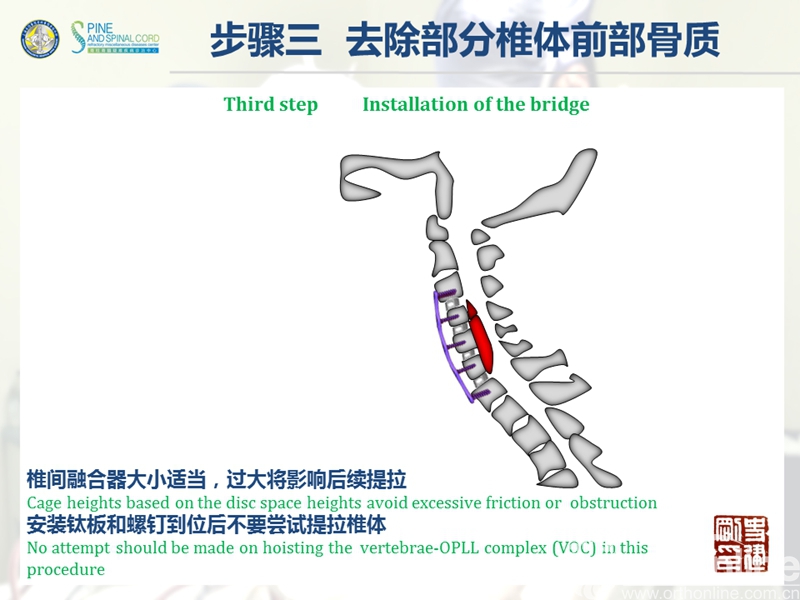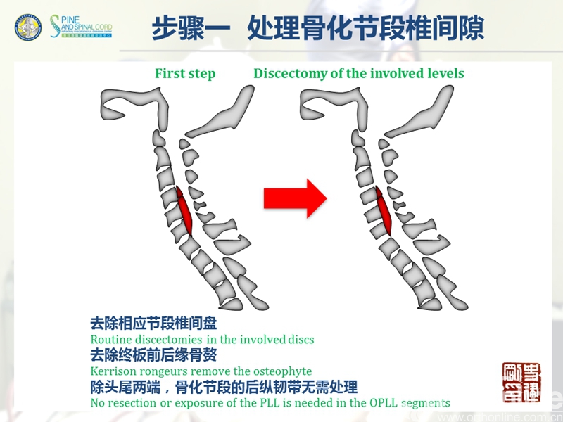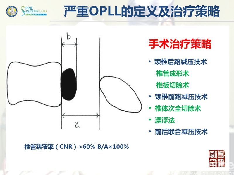 颈椎后纵韧带骨化症(ossification of the posterior longitudinal ligament,OPLL)是一种椎管内韧带肥厚骨化,压迫脊髓神经所导致的疾病。严重OPLL指骨化物使椎管狭窄率达75%以上,产生不同程度的脊髓损害;传统手术主要包括前路切除骨化物的直接减压和后路扩大椎管的间接减压。目前研究认为,前路手术效果较好但风险极高,而后路手术相对安全但效果不够满意。该疾病的手术治疗是脊柱外科界一个重要疑难问题。