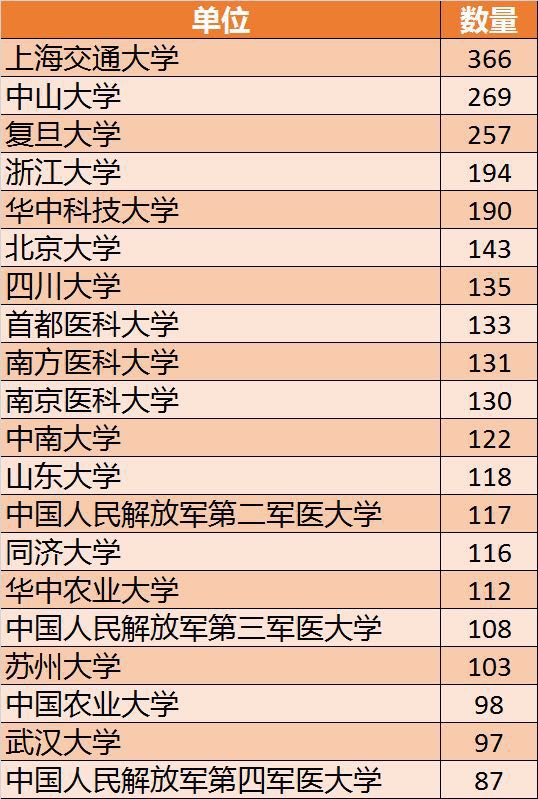 在生命科学与医学科学部获得国家自然基金委员会资助的576个单位中,上海交通大学、中山大学、复旦大学、浙江大学、华中科技大学、北京大学、四川大学、首都医科大学、南方医科大学和南京医科大学分别位列生命科学与医学科学部前十名。
