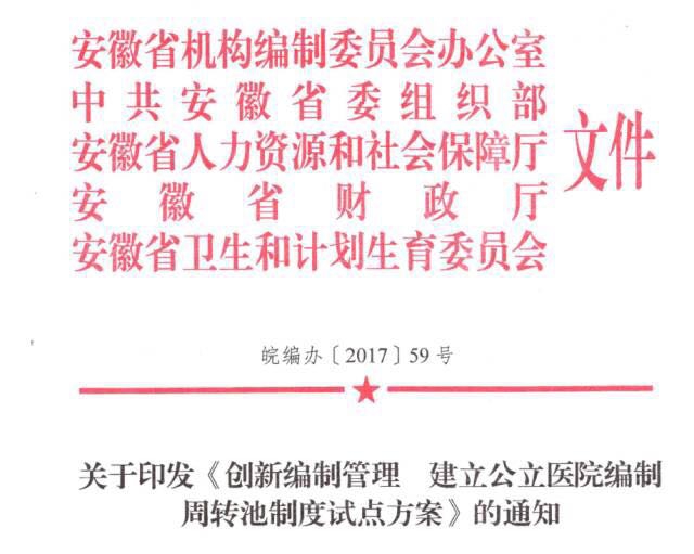 在今年6月份,安徽省卫计委发布了“关于印发《创新编制管理 建立公立医院编制周转池制度试点方案》的通知”(简称《通知》),里面对于编制周转池做了详细介绍和要求。