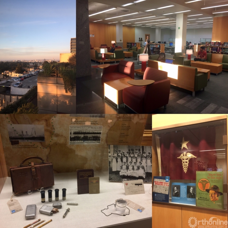 Kalmanovitz图书馆是我参观的第一个地方,也是我后来除手术室和门诊外最常去的地方。图书馆里陈列着一战时期医疗器械和当时医护工作者的日常用品与书信,听介绍才知道UCSF曾经参加了第一次世界大战的后方救援工作。大大的落地窗前摆放着两排沙发可供人中午休息,其中也有不少穿着刷手服躺在沙发上午休的,也有人脚放在脚蹬上远眺窗外海边的金门大桥。图书馆宽敞明亮的大厅,角落里的咖啡吧香气四溢,这里散发着活跃而又自由的学习气氛。