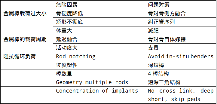 导致断棒的潜在问题:PSO导致脊柱不稳;骨质延长愈合或假关节形成;固定远端力臂活动过大;棒本身脆弱。断棒的发生率:总发生率5-25%;术中有PSO:15-25%;无PSO的2-10%;术后2年高发;PSO和non-union是主要危险因素(断棒在PSO节段或附近,断棒与棒的粗细和椎间融合无关)。