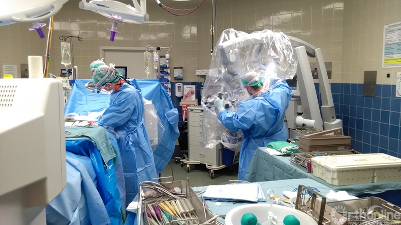手术室内部的布局和术中情况,图中正在操作的是神经外科第6年的住院医师