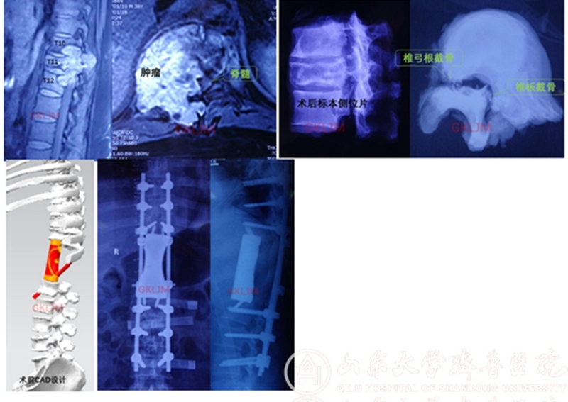 该患者因“双下肢疼痛、麻木1个月,无力10余天”来齐鲁医院就诊,之前曾在当地医院行穿刺活检,病理报告为低度恶性脊索瘤,因当地医院无能力切除肿瘤,患者慕名找到齐鲁医院骨肿瘤科李建民主任。当时患者已无法站立,处于截瘫的边缘,检查发现肿瘤累及第10-12三个胸椎,右侧椎旁形成软组织包块并侵犯膈肌,肿瘤侵入椎管压迫脊髓造成截瘫。