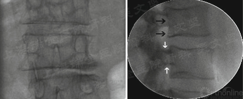 术前通过调整体位、手术床获得真正的正侧位透视。理想的正位透视,棘突应该位于中间,上下终板平行,如果患者有脊柱侧弯,建议通过调整手术床而不是通过调整C臂获得真正的正位透视。理想的侧位透视,椎体上下终板应该平行,椎弓根上下缘清晰无重叠影。(图1)