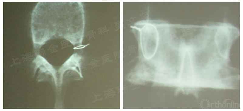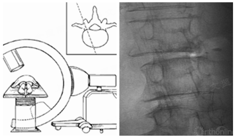 在确定进针点以后,就可以把Jamshidi针轻轻敲击进入椎弓根内,如果遇到助力应该及时停下透视确认。椎弓根的长度一般为2.0-2.5cm,因此如果Jamshidi针在进入2.0-2.5cm以后在椎弓根安全透视范围内,一般可以确认穿刺径路在椎弓根内,是安全的。基于这一原则,在正位的透视下即可以完成椎弓根的穿刺,然后后再透视侧位确认,而无需反复透视侧位片。