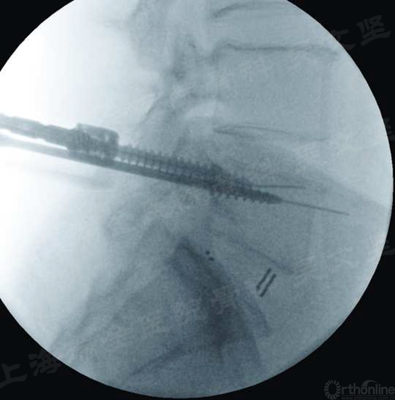 Jamshidi针穿刺完成以后,即可拔出内芯,插入导针,然后进行攻丝和螺钉植入等操作。导针是经皮椎弓根螺钉植入的重要导引,但导针如果使用不当,轻者可能因为导针拔出而延长操作时间,严重者可能因为导针穿破椎体前方导致血管和内脏损伤等严重并发症。(图4)