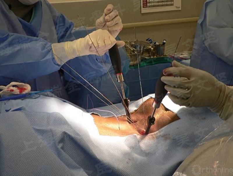 c) 对于多个节段的经皮螺钉,应该注意各个螺钉的深度相对一致,否则可能会造成锁定螺帽植入的困难。