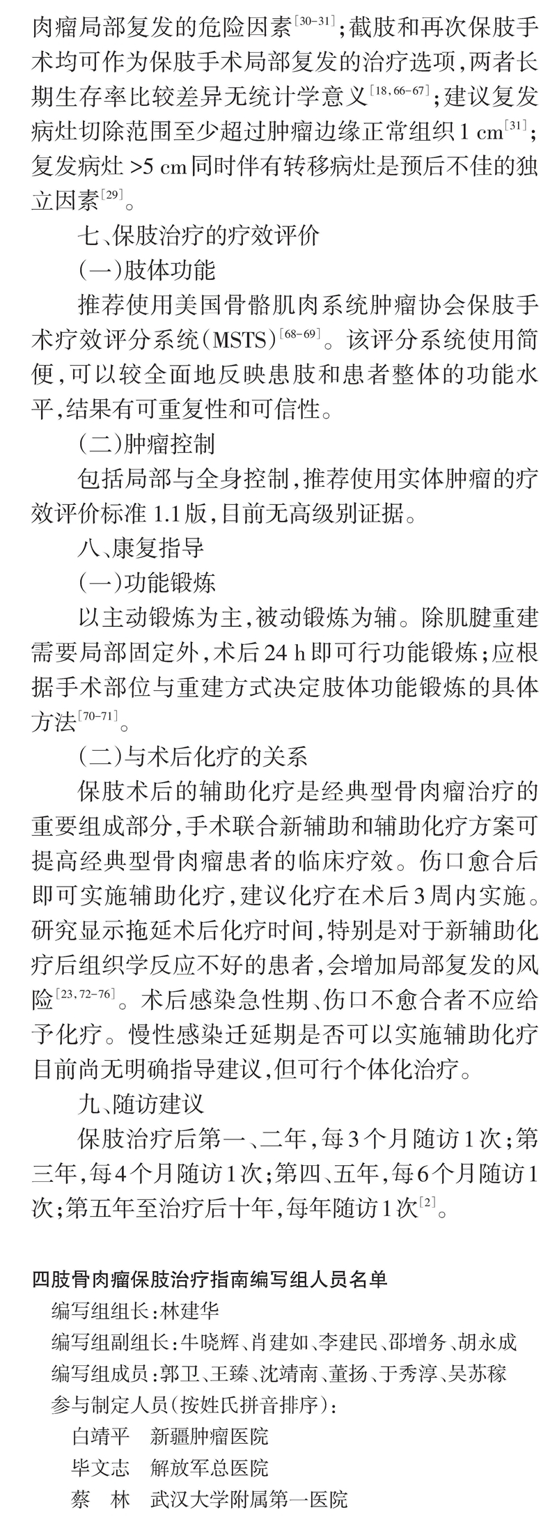 我国幅员辽阔,但技术发展不平衡,需要理论涵盖充分、技术指导性强且适用于骨肉瘤治疗领域的保肢治疗指南。因此,本指南从保肢治疗定义、手术方法、疗效评价、术后处理与并发症防治、康复指导与随访建议等方面系统介绍四肢骨肉瘤保肢治疗方法,从而规范和推进保肢手术技术发展,提高保肢治疗成功率。