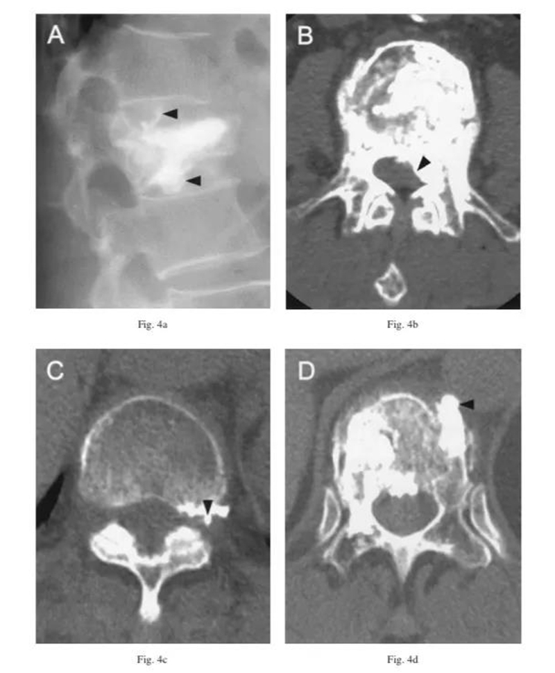 C经皮质缺损渗漏:顺着缺损区到处跑,椎体周围、椎管内、椎间盘,哪里有路往哪走。