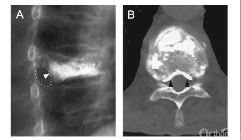 侧位X片看骨水泥在椎间孔周缘,CT显示渗漏进入椎管,累及椎间孔。