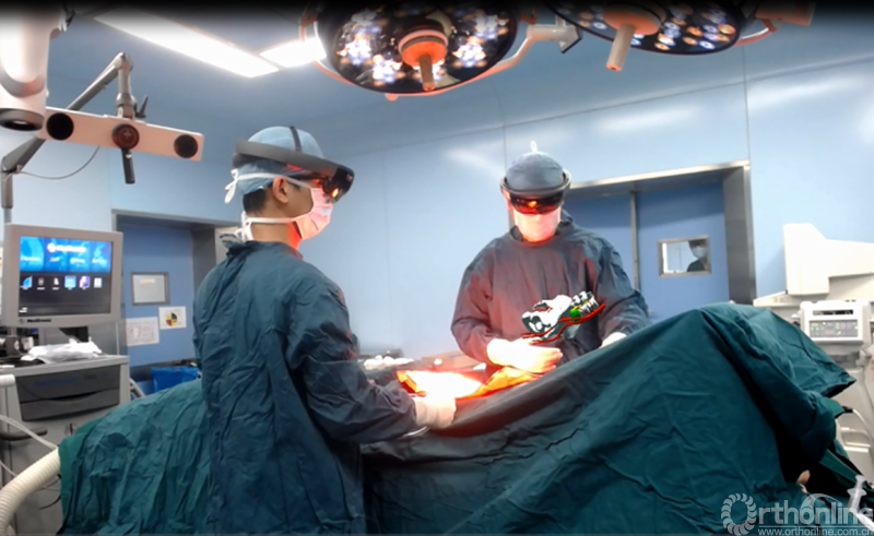 MR技术是将患者病灶的虚拟3D影像投射到手术区域中,实现虚拟世界和现实世界信息互通的技术。患者的病灶模型和假体,可以利用MR设备进行实景立体播放,弥补了影像学片子无法现场立体成像的缺陷。术前患者及其家属可以像看电影一样了解病情和手术方案,术中医生戴上MR眼镜通过手势操作三维影像的移动、缩放,适配患者的体位,划定肿瘤的边界和切除范围,医生不再完全依赖于想象力做手术,真正做到边看边做,心中有数。