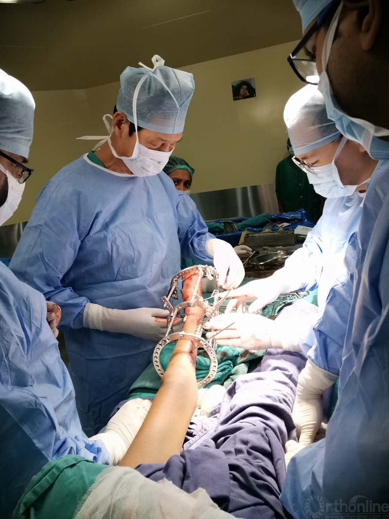 第二天,JSS医学院及附属医院安排了全天的继续教育课程,近百名印度骨科医生在会场观看手术直播,秦泗河教授及臧建成博士边手术边讲解,学员在教室提问、手术室解答,秦泗河教授的下肢矫形手术方法、Ilizarov技术的穿针固定技巧、超凡的手术技能,使配台的印度骨科医生及会场代表领略了中国骨科专家的手术神韵。5台手术结束后,秦泗河教授回到会场与学员代表展开讨论。