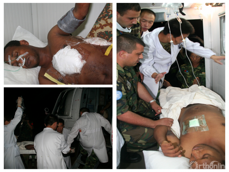 这名军官伤势很重,他的伤情牵动着驻扎在当地的全体埃塞俄比亚军人的心。在医疗队抢救他期间,整个医院被埃塞俄比亚兵围了起来,如此大的阵势给医疗队增加了很大的压力。医疗队依照联合国标准流程(SOP)给他做了闭式引流,当晚急转送往三级医院治疗。