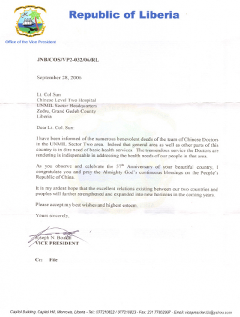 中国驻利比里亚大使馆致函鼓励医疗队圆满完成维和任务