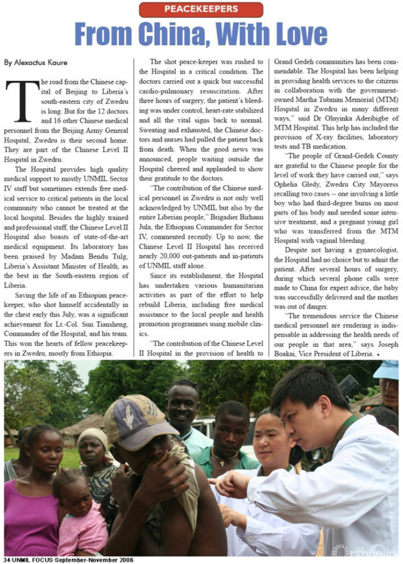 2006年4月的一天,原北京军区总医院(现解放军总医院第七医学中心)孙天胜副院长率领43名中国人民解放军医疗队队员,历经18个小时,从春暖花开的北京经乌鲁木齐、巴黎飞抵利比里亚首都蒙罗维亚。