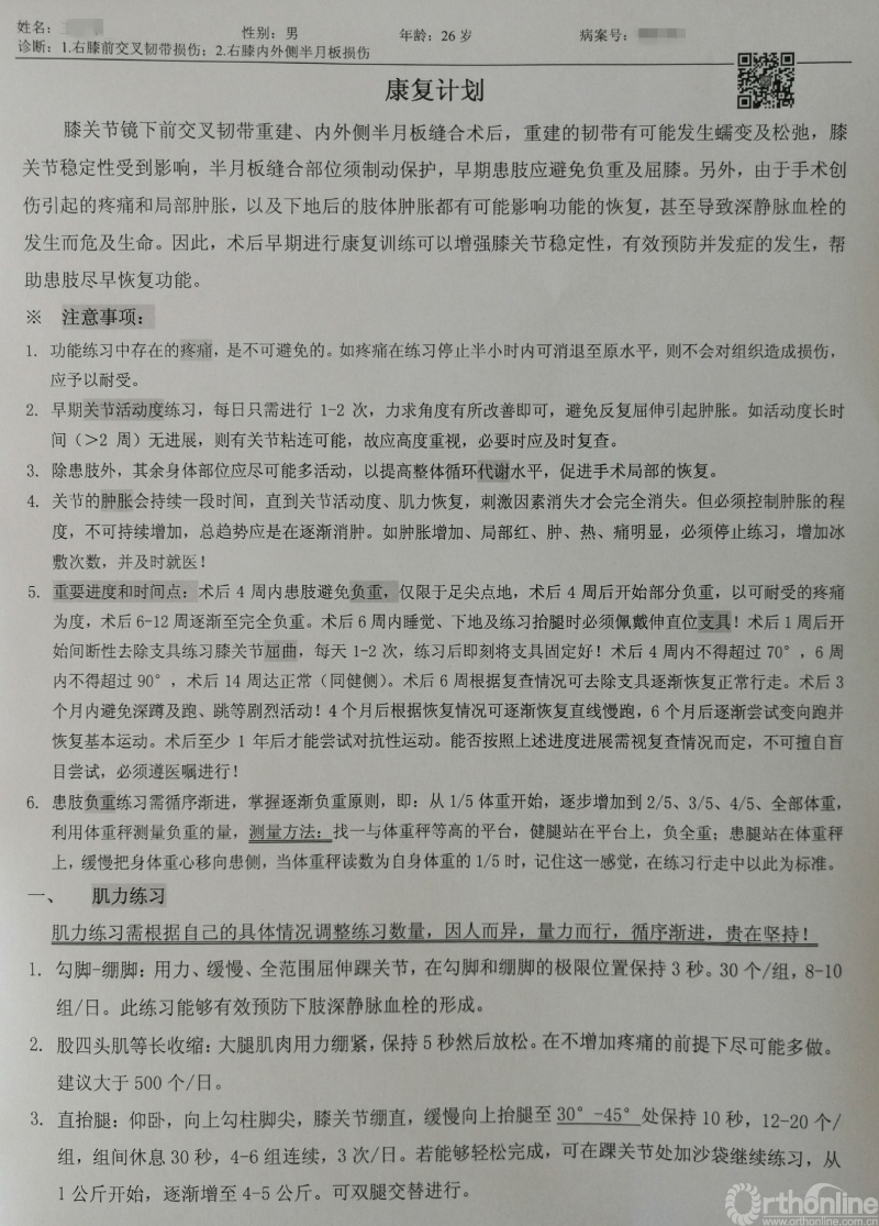 解放军总医院第七医学中心膝关节ACL重建术后家庭康复计划