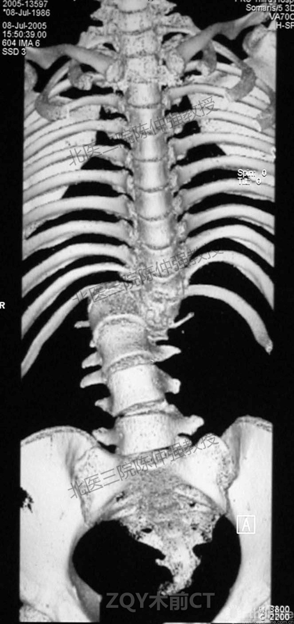 患者女性17岁,胸腰椎陈旧结核性侧后凸畸形,局部呈“麻花状”扭转,无神经功能受损表现。2005年,陈仲强教授带领团队实施后路+侧前方联合入路脊柱节段切除、双轴旋转矫形术。术后患者外观显著改善,神经功能正常。术后随访证实患者截骨矫形节段骨性融合良好,矫形效果持续良好。