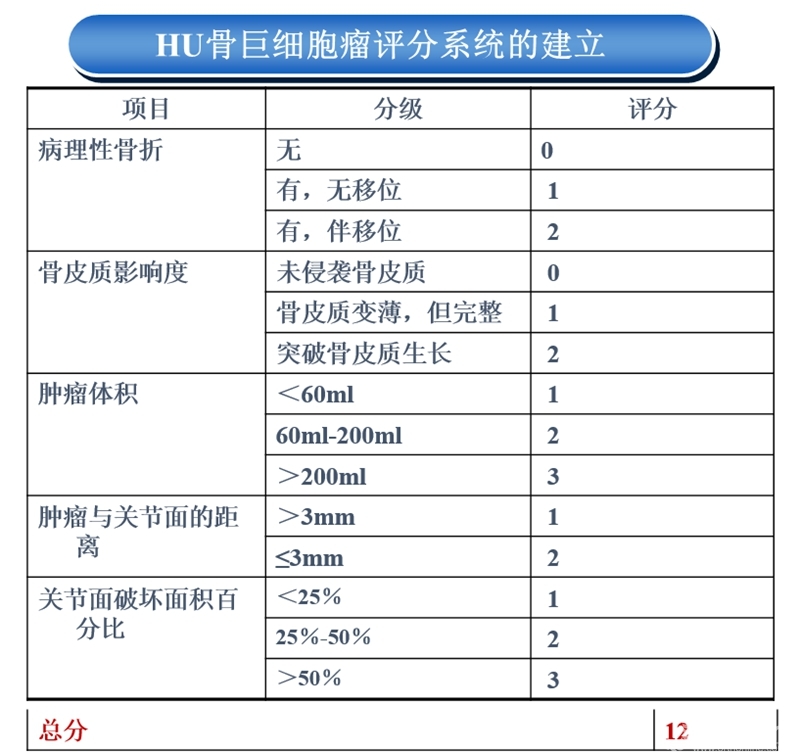虽然通过以上建议可指导一部分临床治疗,但权衡手术“侵袭性”、术后肿瘤复发与肢体功能之间的平衡。胡永成教授常说,大夫的一刀常常就是患者的一辈子,只有标准化才是科学化。因而他认为临床建立起完备的评分系统,对指导骨巨细胞瘤患者的救治意义重大。